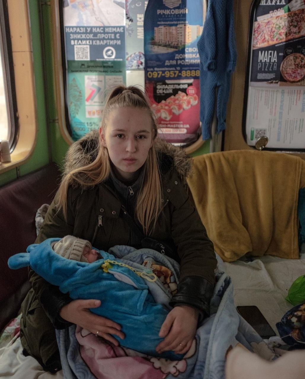 ロシアの侵攻以来、ハルキウの地下鉄駅内の車両で暮らす19歳の母と侵攻1週間後に生まれた赤ん坊
