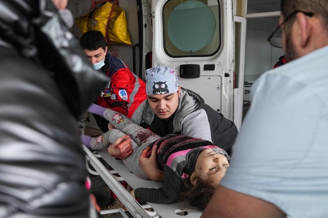 ウクライナのマリウポリで、ロシアの砲撃によって負傷した子どもたち(2022年2月27日)
