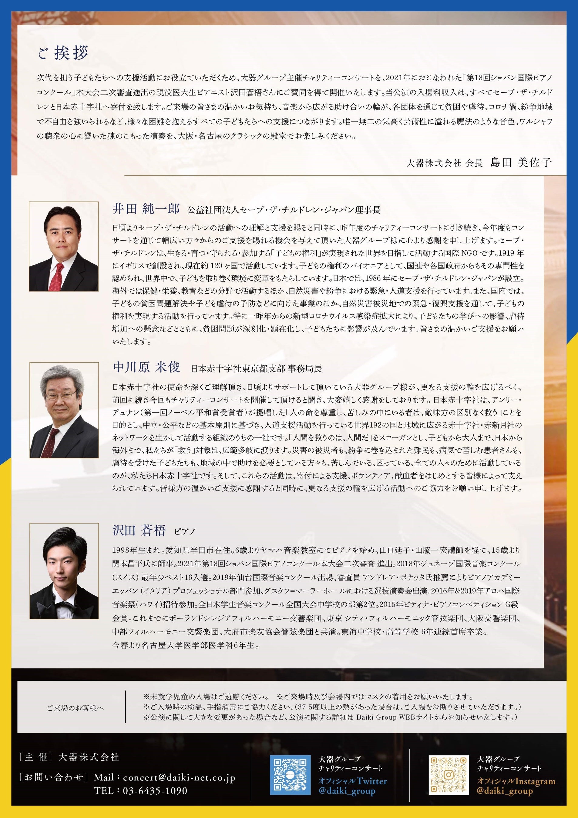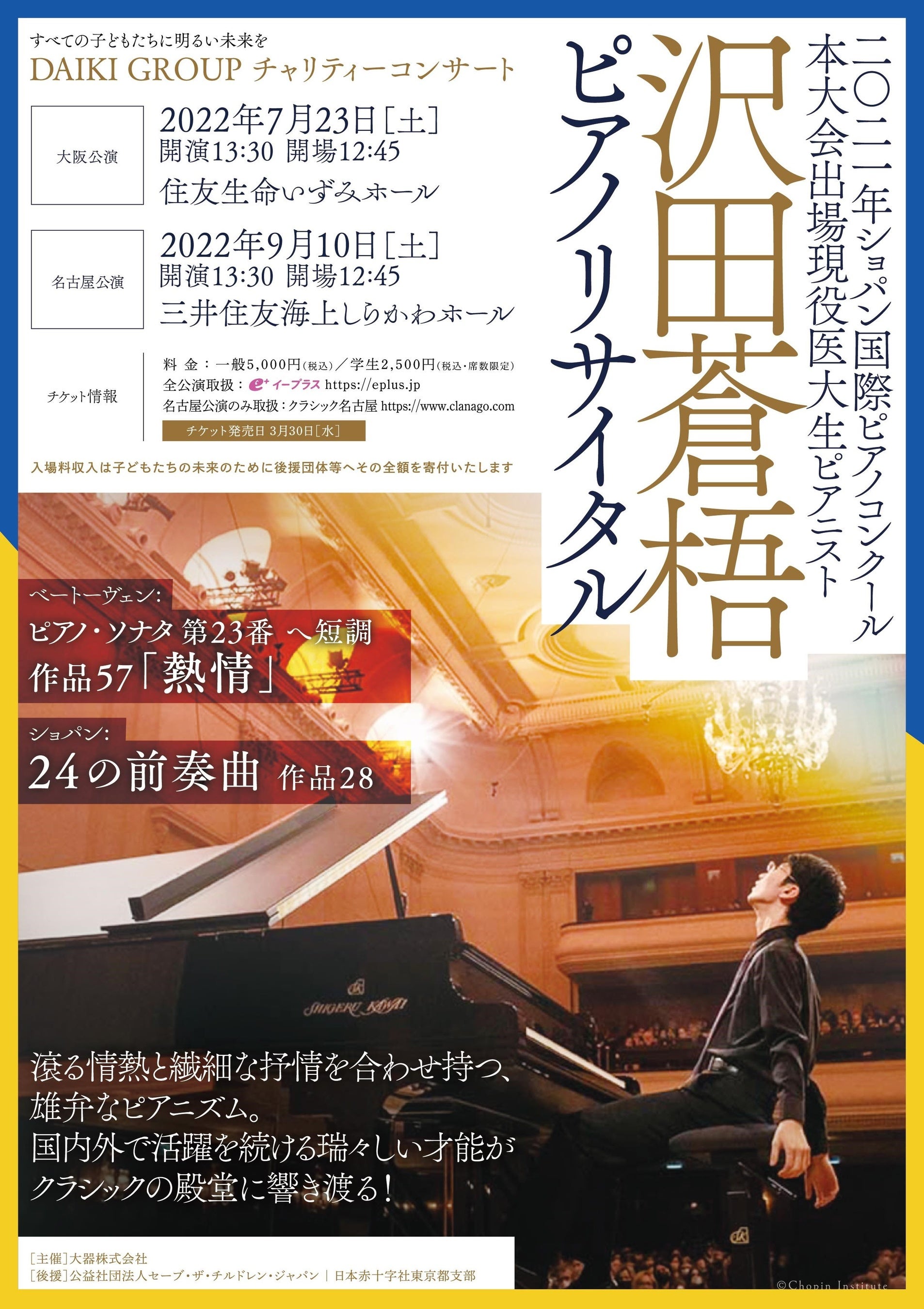 次代を担う子どもたちを支援すべくDAIKI GROUPチャリティーコンサート「沢田蒼梧ピアノリサイタル」の入場料収入は、すべてセーブ・ザ・チルドレンと日本赤十字社に加え、在日ウクライナ大使館へ寄付を致します。ご来場の皆様の温かいお気持ちが、各団体を通じて貧困や虐待、コロナ禍、紛争地域で不自由を強いられるなど、様々な困難を抱えるすべての子どもたちへの支援につながります。「第18回ショパン国際ピアノコンクール」本大会二次審査進出の現役医大生ピアニスト沢田蒼梧さんの唯一無二の気高く芸術性に溢れる魔法のような音色、ワルシャワの聴衆の心に響いた魂のこもった演奏をお届けし、音楽から広がる助け合いの輪となり、少しでも多くの支援をお届けしたいと思います。