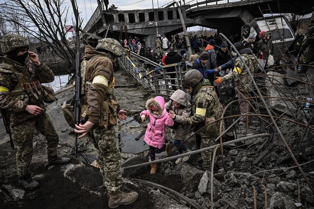 激しい砲撃と爆撃の中、キーウ北西のイルピンの街から避難している市民(2022年3月5日)