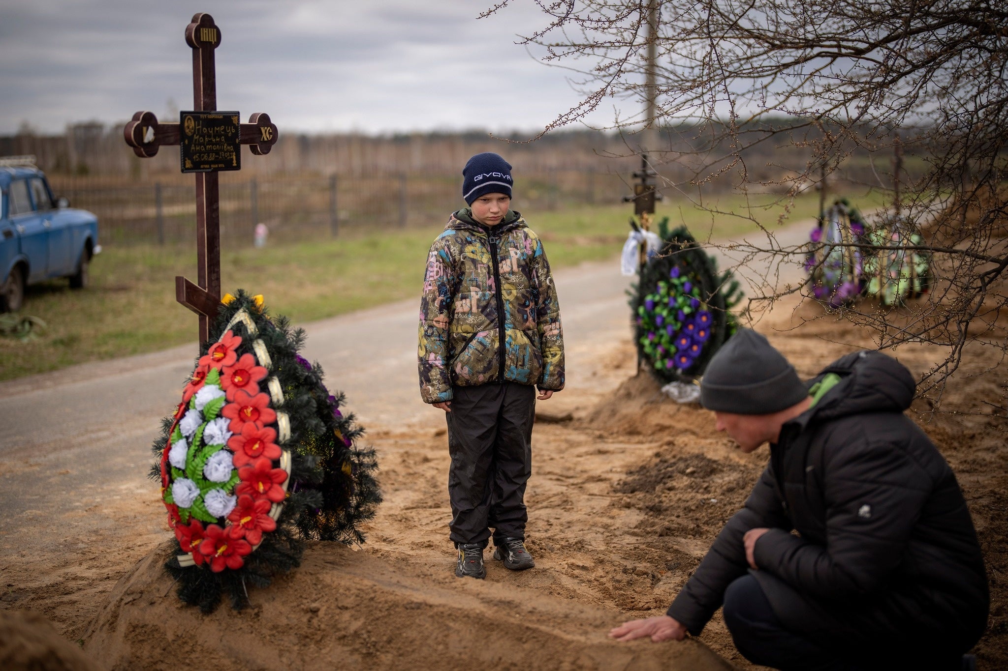 ブチャで、ロシアの軍事侵攻に死亡した母親の葬儀に参列している10歳の少年(2022年4月)