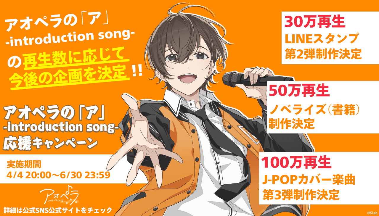 2022年3月にプロジェクト発足1周年記念のイベントで先行公開された『アオペラ』のオリジナル楽曲『アオペラの「ア」-introduction song-』が、5月23日(火)に再生回数100万回を達成しました。「100万再生でJ-POPカバーMV第3弾制作決定」を達成条件に、公開と同時にスタートした応援キャンペーンは、多くの方に支持され、ついに目標を達成することができました。温かい応援に、スタッフ一同大変嬉しく思っております。