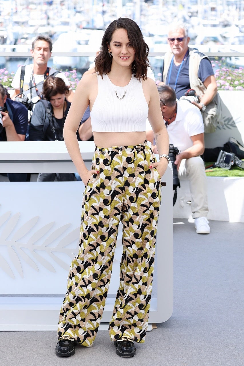クロップドトップス、グラフィカルなプリントのパンツとローファーをあわせたルックで登場。