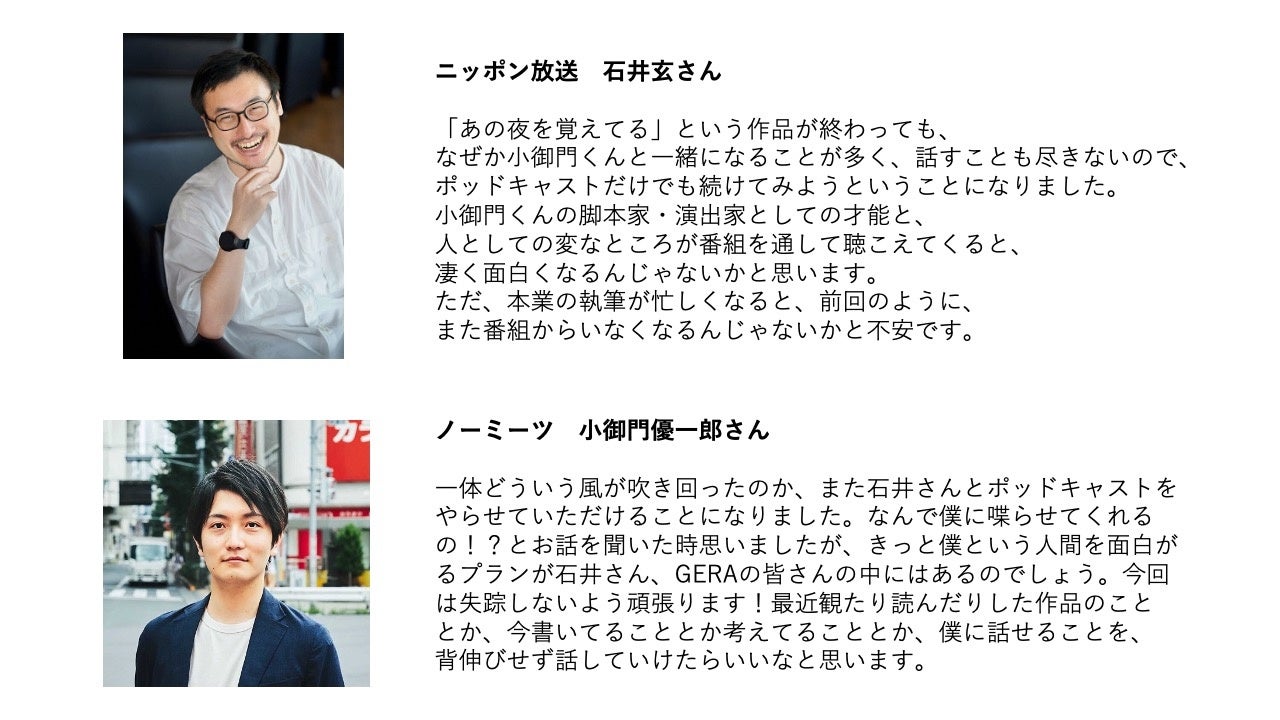 石井玄と小御門優一郎のふたりが日々の出来事や最近気になるコンテンツ、脚本家である小御門が思わず嫉妬してしまった作品などについて、なぜ面白いかなどを滔々と語るポッドキャスト番組。