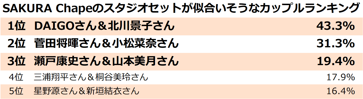 続いて幻想的なSAKURA Chapelのスタジオセットが似合うと思う芸能人カップルのランキングです。