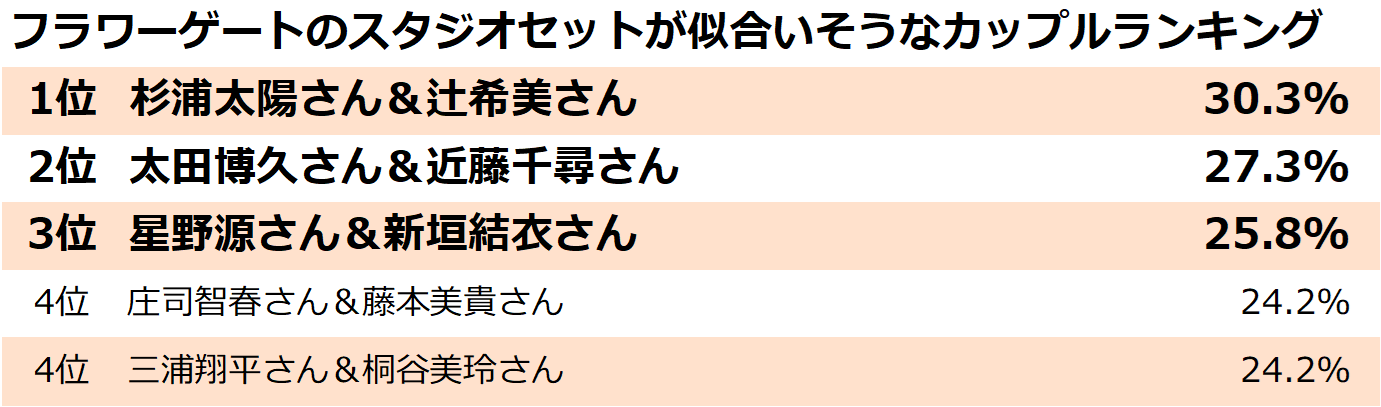 まずはフラワーゲートが似合うと思う芸能人カップルのランキングです。