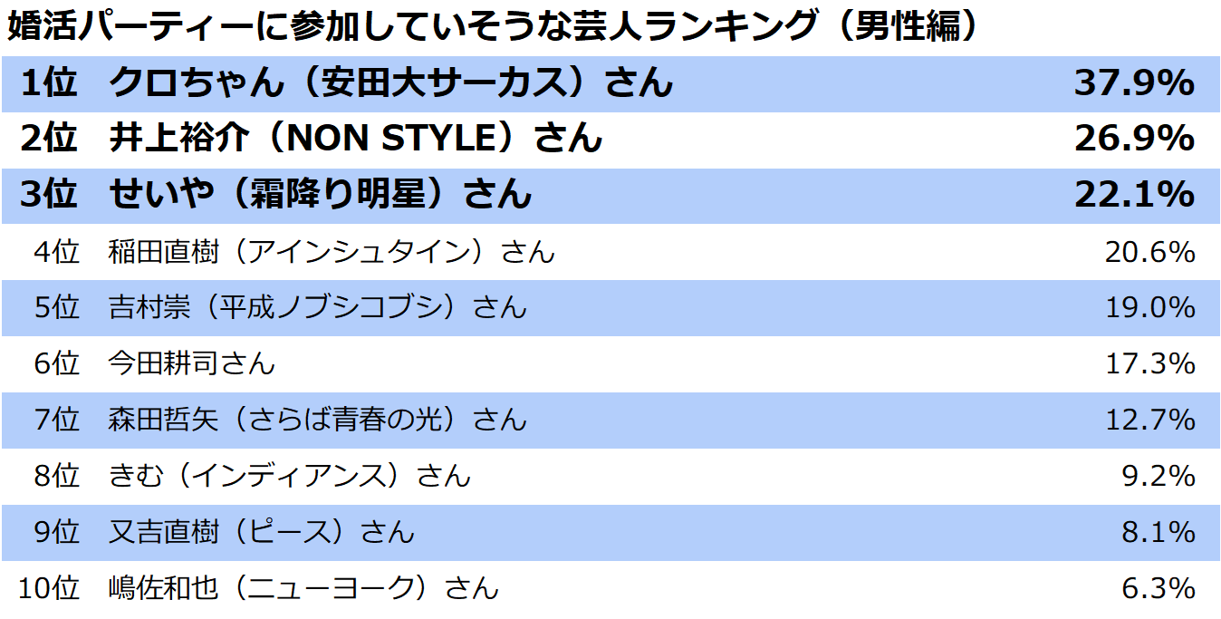 婚活パーティーに参加していそうな男性芸人について聞いてみました。ランキングは以下の通りです。