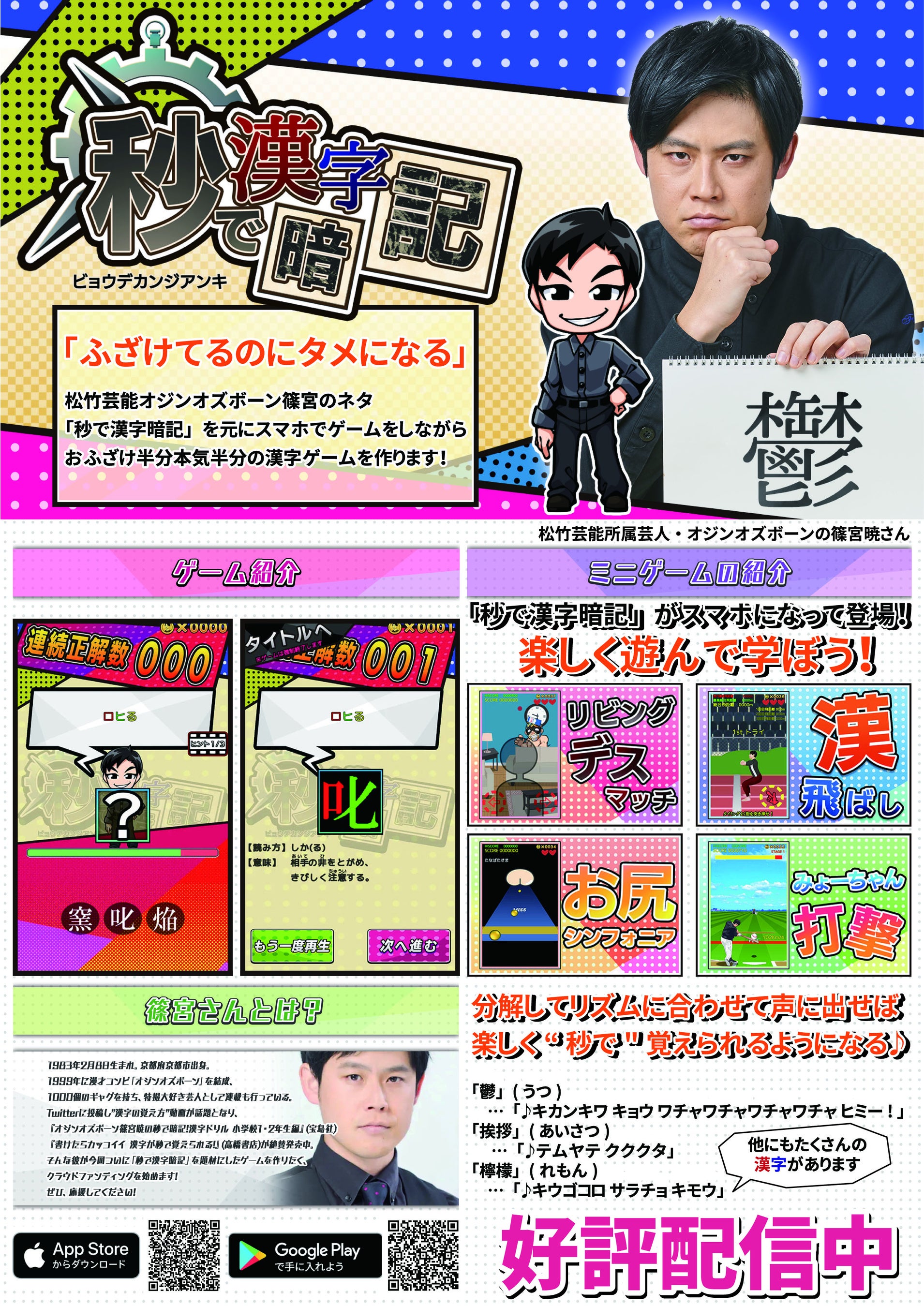 オジンオズボーン篠宮が開発した難読漢字の新しい覚え方「秒で漢字暗記」がアプリゲームになりました。