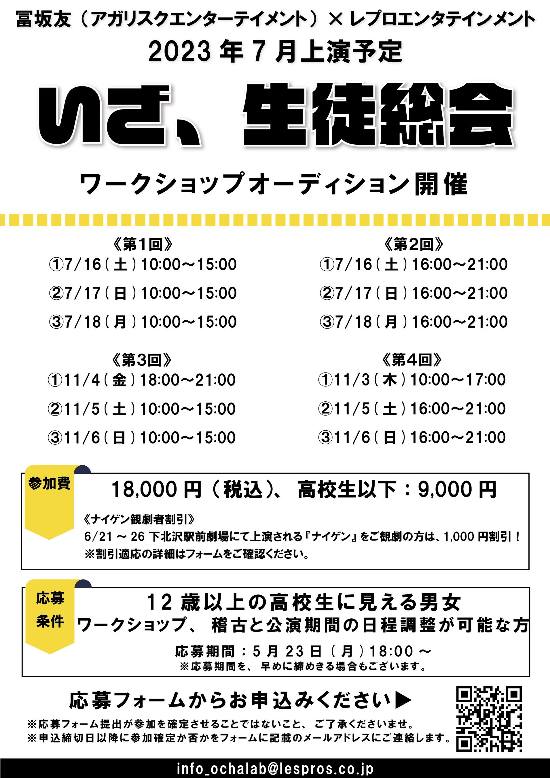 レプロエンタテインメントと冨坂友(アガリスクエンターテイメント)とタッグを組み、2023年7月に浅草九劇にて、冨坂氏の人気作品『いざ、生徒総会』を上演することが決定しました。つきましては、キャスト選考を兼ねたワークショップオーディションを実施いたします。