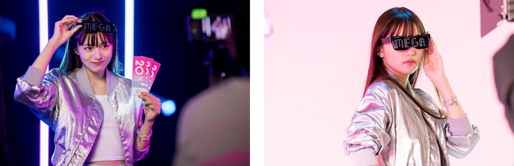 “メガ割”新CM撮影用としてオリジナルデザインされた「MEGAサングラス」をかけた姿が世界観にとてもフィットしていた川口さん。そして「この機会に、欲しい物をゲットしよ!」というセリフ終わりの部分に関して、頭を横に傾けて可愛らしさを出して欲しいというスタッフからの指示に、監督のイメージ通りのポージングで応えた川口さん。「可愛いー!」とスタッフたちの声がスタジオ中に響きました。