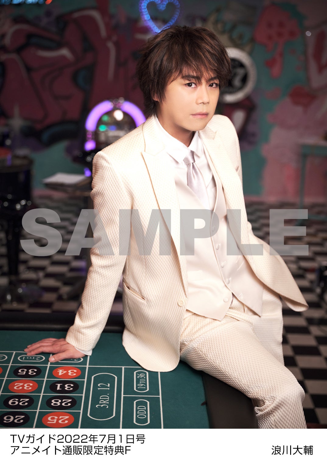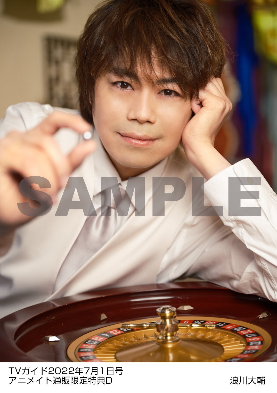 また、アニメイト通販にて「TVガイド関東版2022年7/1号」を購入すると、特典として浪川大輔の生写真がプレゼントされる限定企画も。電話ボックスから見つめているショット、小さい車に乗った決めカット、色鮮やかな布の上で横たわる姿、ルーレットの球を差し出したりルーレットテーブルに座っているシチュエーション、帽子&メガネ姿で眼差しを向けるポーズといった、全6種類の絵柄のなかから1枚を選ぶことができる。