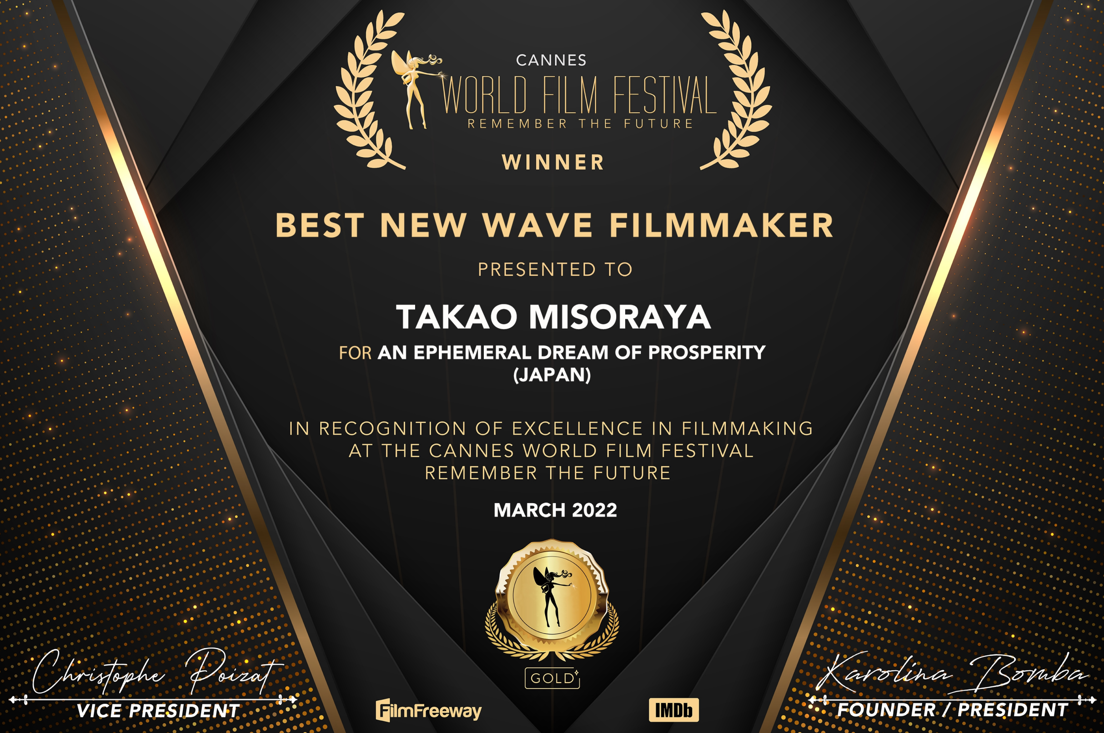 On April 28, 2022, Fukuoka-based stage actor Takao Misoraya (born in Fukuoka, Japan; Fukuyo Kaihatsu Co., Ltd.) is pleased to announce that his feature film “An Ephemeral Dream of Prosperity-Kantan no Yume,” which he directed and wrote, has won two awards at the Cannes World Film Festival – Remember the Future: The film won the BEST NEW WAVE FILMMAKER and BEST ASIAN FILMMAKER at the Cannes World Film Festival – Remember the Future, and was nominated in five other categories.