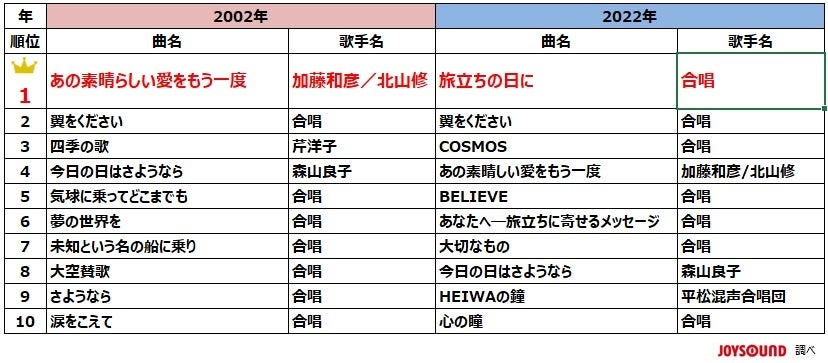 なお、このたび公開となった合唱曲の20年前(2002年当時)、最新(2022年)のカラオケランキングTOP10は以下の通りです。