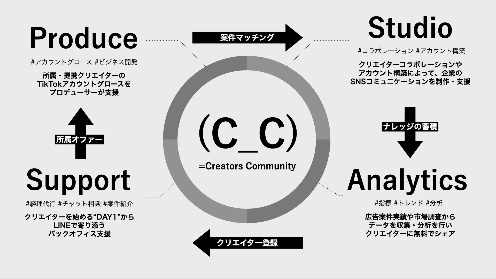 新事業「CC」は、「TikTokをはじめとしたSNSを活用し、表現活動をするクリエイターのプロデュース」、さらに「クリエイターに向けての広告案件獲得」、そして「クリエイターのマネジメント活動」を中心に展開致します。目標として年内に50,000人以上のクリエイターをサポート、年間売上10億円以上を目標に事業を推進してまいります。