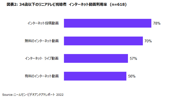 多くの消費者にとって、インターネット上の動画はリニアテレビの代わりではなく、追加のエンターテイメントオプションとして利用されている傾向が伺えます。インターネット動画の利用が拡大している中でも、若年層を含む消費者の多くは、毎日リニアテレビを視聴していることがわかります。実際「ニールセン・ビデオコンテンツ アンド アド レポート 2022(Nielsen Video Contents & Ads Report 2022)」によると、35歳未満の約80%がリニアテレビを視聴し、半数以上は毎日視聴しています(図表1)。また、これらの若い視聴者のもう一つ重要な特徴として、リニアテレビを視聴しているだけでなく、様々な形式のインターネット動画を利用する傾向もあることがわかりました。リニアテレビを視聴している35歳未満の人の70%以上が、インターネット投稿動画や無料のインターネット動画も視聴しています(図表2)。