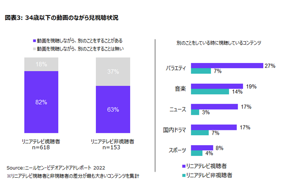若年層の大多数がリニアテレビを視聴していますが、一方で23%は視聴していないこともわかっています。マーケティング担当者はこれらの層にリーチするために、どのようにコミュニケーションを設計していくべきなのでしょうか。リニアテレビを視聴しない若年層は、利用するインターネット動画サービスの数も少ない傾向があり、31%は無料のインターネット動画や投稿動画などのカテゴリーのうち、1つの動画カテゴリーのみを利用する傾向があります。つまり、リニアテレビを視聴しない人が利用するインターネット動画サービスは分散化しているため、より多くの人にリーチするためには様々なサービスをメディアプランに取り入れることが必要になってきます。また、リニアテレビ視聴者のうち82%の人は動画コンテンツを見ながら別のことをすることがあると回答していますが、非視聴者では63%にとどまっています。「バラエティー」、「ニュース」、「国内ドラマ」などのコンテンツは「ながら見」されやすい傾向がありますが、このようなカテゴリーでもリニアテレビの非視聴者では、「ながら見」する割合は一桁にとどまっています。つまり、リニアテレビを視聴しない人は、動画を視聴する際にコンテンツに集中して視聴する特徴があるため、コミュケーションを図る際にも、注目してもらい覚えてもらうきっかけに繋がりやすくなります。マーケティング担当者としては、このような動画コンテンツを活用することで、より効果的にコミュニケーションをしていく一つの手段になることでしょう。