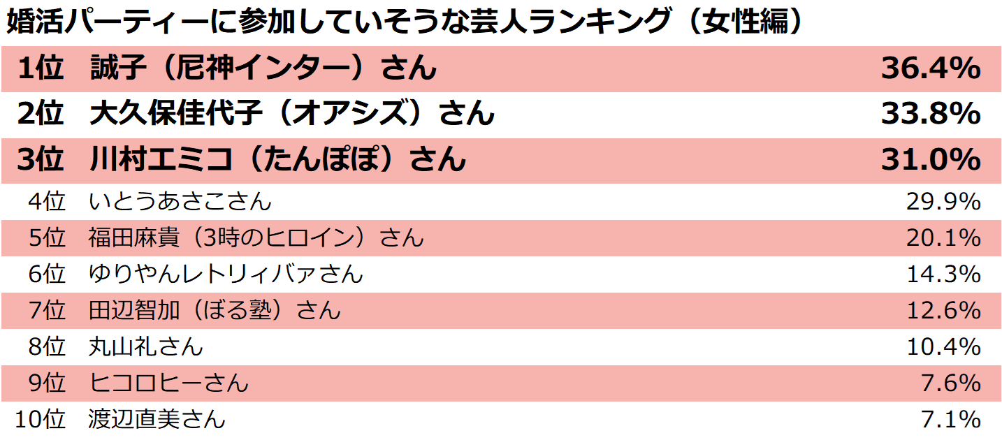 今回は、引き続き女性編として「婚活パーティー参加していそうな女性芸人」に関するランキングを発表いたします。