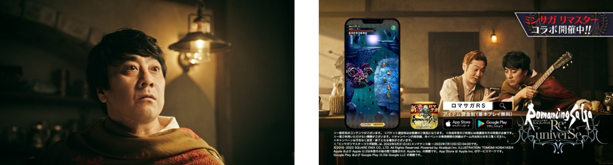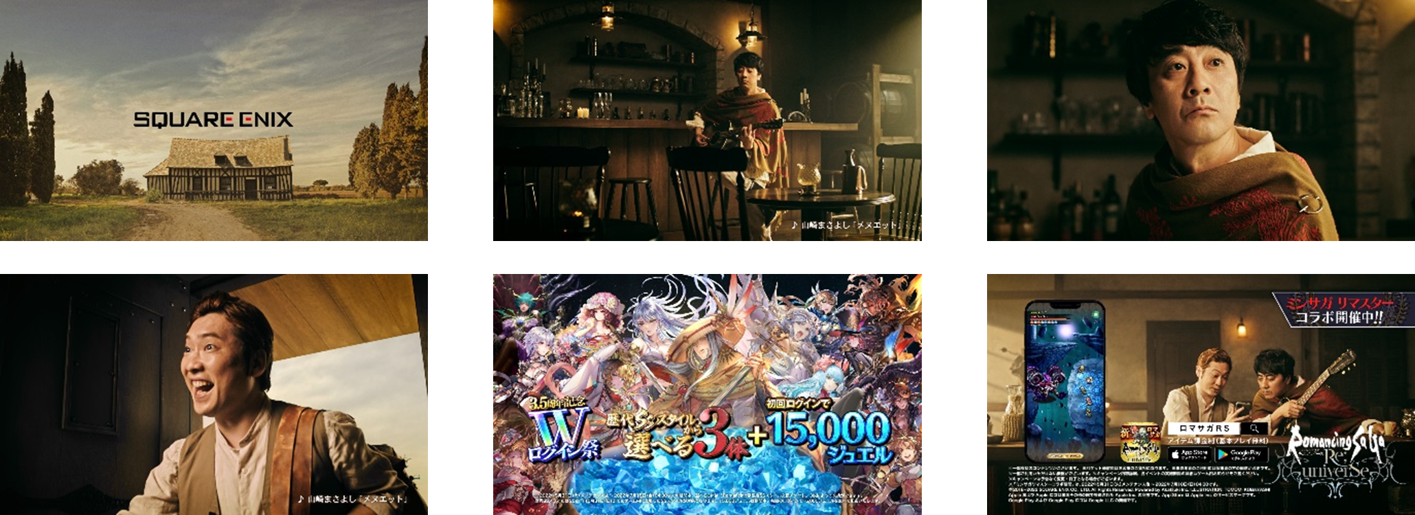 株式会社スクウェア・エニックス(本社:東京都新宿区新宿、代表取締役社長:松田洋祐)は、「サガ」シリーズ完全新作である好評配信中のスマートフォン向けRPG『ロマンシング サガ リ・ユニバース』がリリースから3.5周年を迎えることを記念して、「サガ」シリーズファンから長年愛されている楽曲「メヌエット」(※2005年に発売された『ロマンシング サガ -ミンストレルソング-』のテーマ曲)を歌唱された山崎まさよしさんと、お笑い芸人のペンギンズ ノブオさんを起用した TVCM『さすらう者たち 篇』を2022年6月1日(水)から放映いたします。