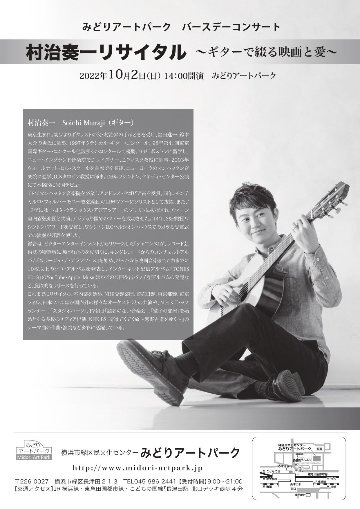 みどりアート&メディアパートナーズ 横浜音祭り2022共催 みどりアートパーク バースデーコンサート『村治奏一リサイタル~ギターで綴る映画と愛~』が2022年10月2日(日)に緑区民文化センター(みどりアートパーク)(横浜市)にて開催されます。チケットはカンフェティ(運営:ロングランプランニング株式会社、東京都新宿区、代表取締役:榑松 ⼤剛)にて6月26日(日)より発売開始です。