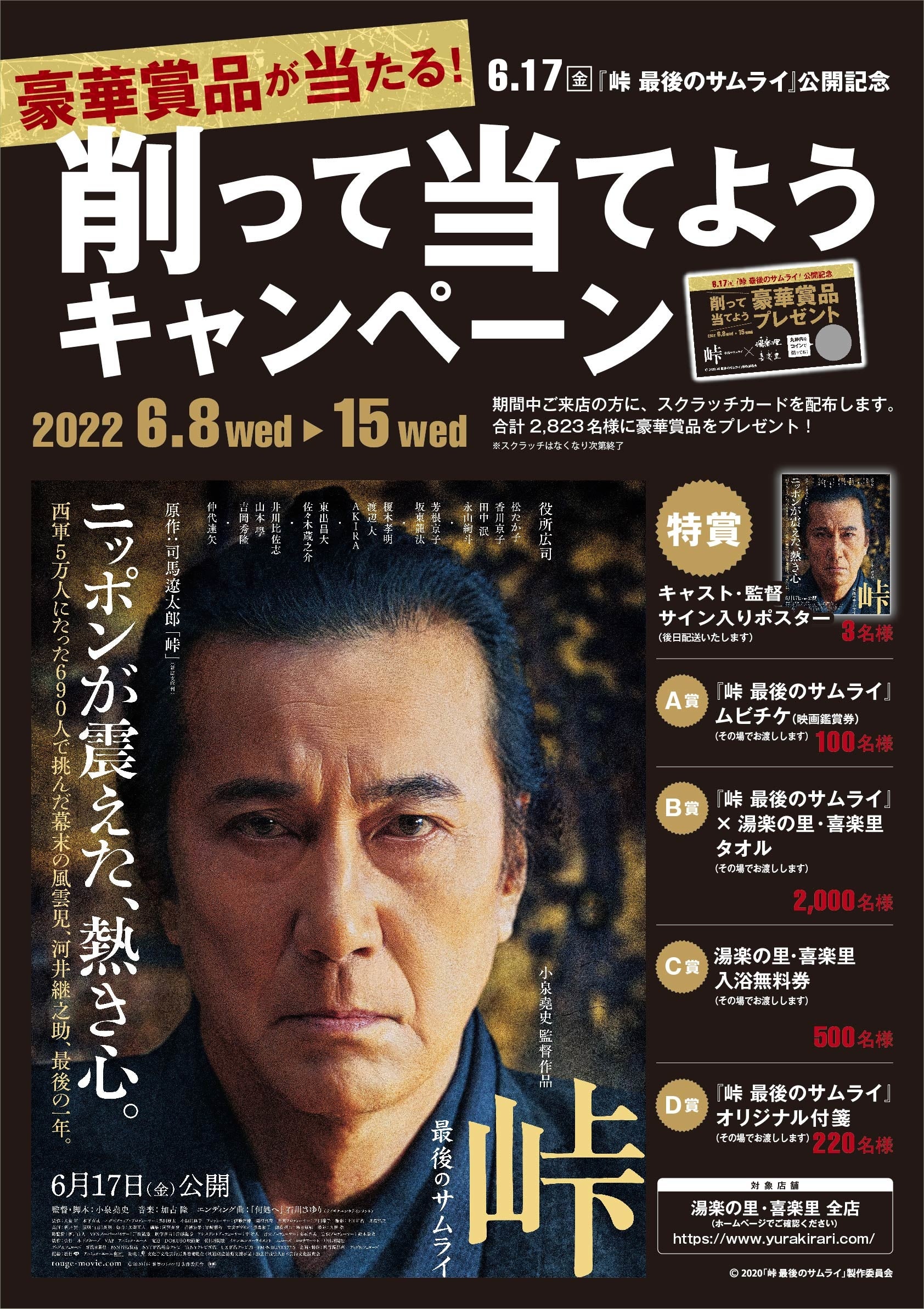 株式会社スパサンフジ(所在地:渋谷区代々木1-35-4 代表取締役社長 末吉 糧)が運営する、日帰り温浴施設「湯楽の里(ゆらのさと)」「喜楽里(きらり)」では、2022年6月8日(水)~2022年6月15日(水)までの期間限定で、 6月17日(金)公開の映画『峠 最後のサムライ』(配給:松竹、アスミック・エース)とのコラボキャンペーンを開催いたします。
