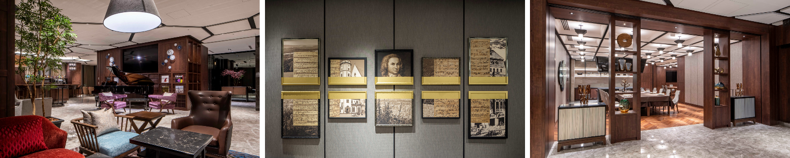 (左)演奏会場「マグダレーナ」、(中央)「J.S. バッハの楽曲」に着想を得たアートピース、(右)ボードルーム「ヴァルト トゥール -森の扉-」