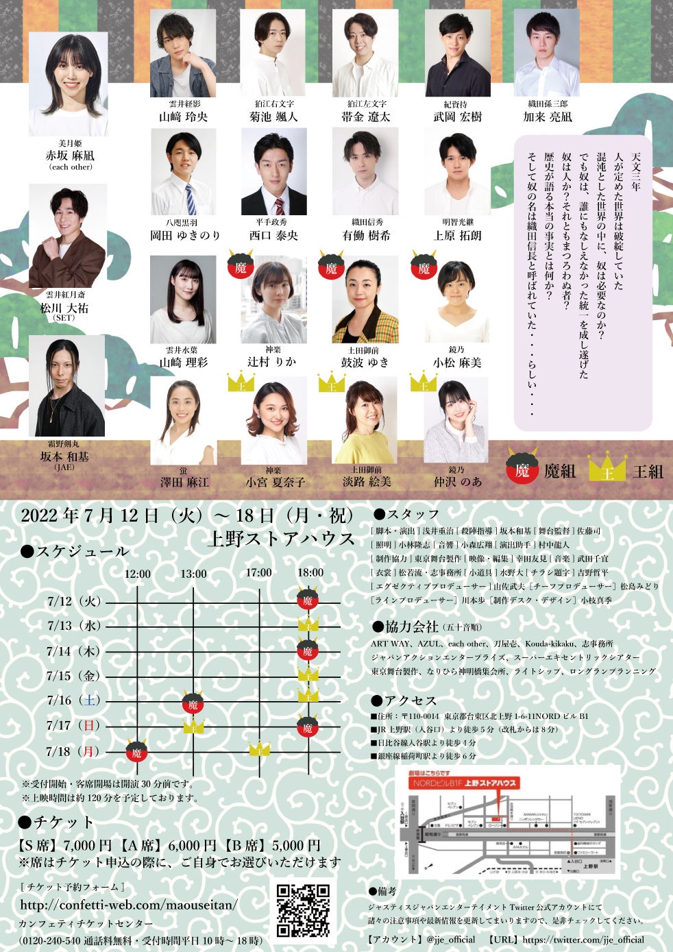 ジャスティスジャパンエンターテイメント(東京都港区、代表:松島 みどり)主催、戦国絵巻~からす瓜~一の巻『魔王生誕』が2022年7月12日 (火) ~2022年7月18日 (月・祝)に上野ストアハウス(東京都台東区)にて上演されます。チケットはカンフェティ(運営:ロングランプランニング株式会社、東京都新宿区、代表取締役:榑松 大剛)にて6月1日(水)12:00より発売開始です。
