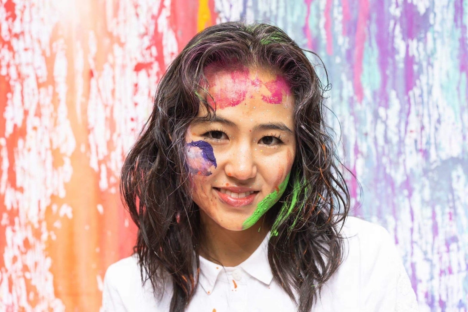10代の頃に夢中になって取り組んだサーフィンを通して、自然と対話をしてきた経験が作品に生かされ、頭で考えず、本能に身を委ねて描くスタイルは、唯一無二の気持ちの良い色彩ができあがる。