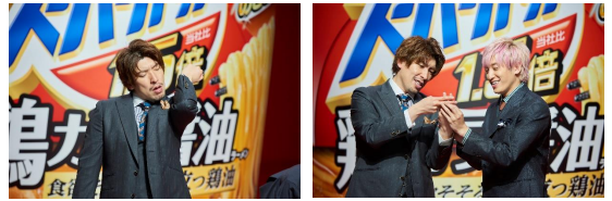 シックなスーツの“大人カッコいい”姿で登場したEXITのお二人。普段の雰囲気とのギャップに現場がざわめきます。お二人が同時に「これぞ大盛り1.5倍!スーパーカップ1.5倍!」とセリフを決めるシーンでは、巨大パッケージを挟みお互いの声が届きにくく、タイミングが合わずに苦戦する場面も見られました。