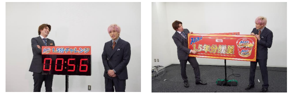 「スーパーカップ1.5倍」の“1.5”にかけて、1.5分ピッタリでEXIT結成5周年の感謝を伝え合う「1.5分チャレンジ」に挑戦しました。りんたろー。さんが「本当はやりたくないと思うけど、髪をピンクにして“チャラ男”として頑張ってくれてありがとう!」と兼近さんに感謝を伝えると、反対に兼近さんは「おじさん役を引き受けてくれるおかげで若者として見られるよ、ありがとう!」と反論。りんたろー。さんから「おい!」と思わず突っ込みが入り、年齢とキャラのギャップに悩むお二人のコンビ愛が垣間見られました。お互いの愛が溢れすぎて1.5分を大幅にオーバーしてしまいましたが、お二人のコンビ愛の大きさに感銘を受けたエースコックから「1.5年分のスーパーカップ」が贈呈されました。まさかの賞品にお二人とも驚きながらも「芸人やってて良かったと!」と大喜びでした。