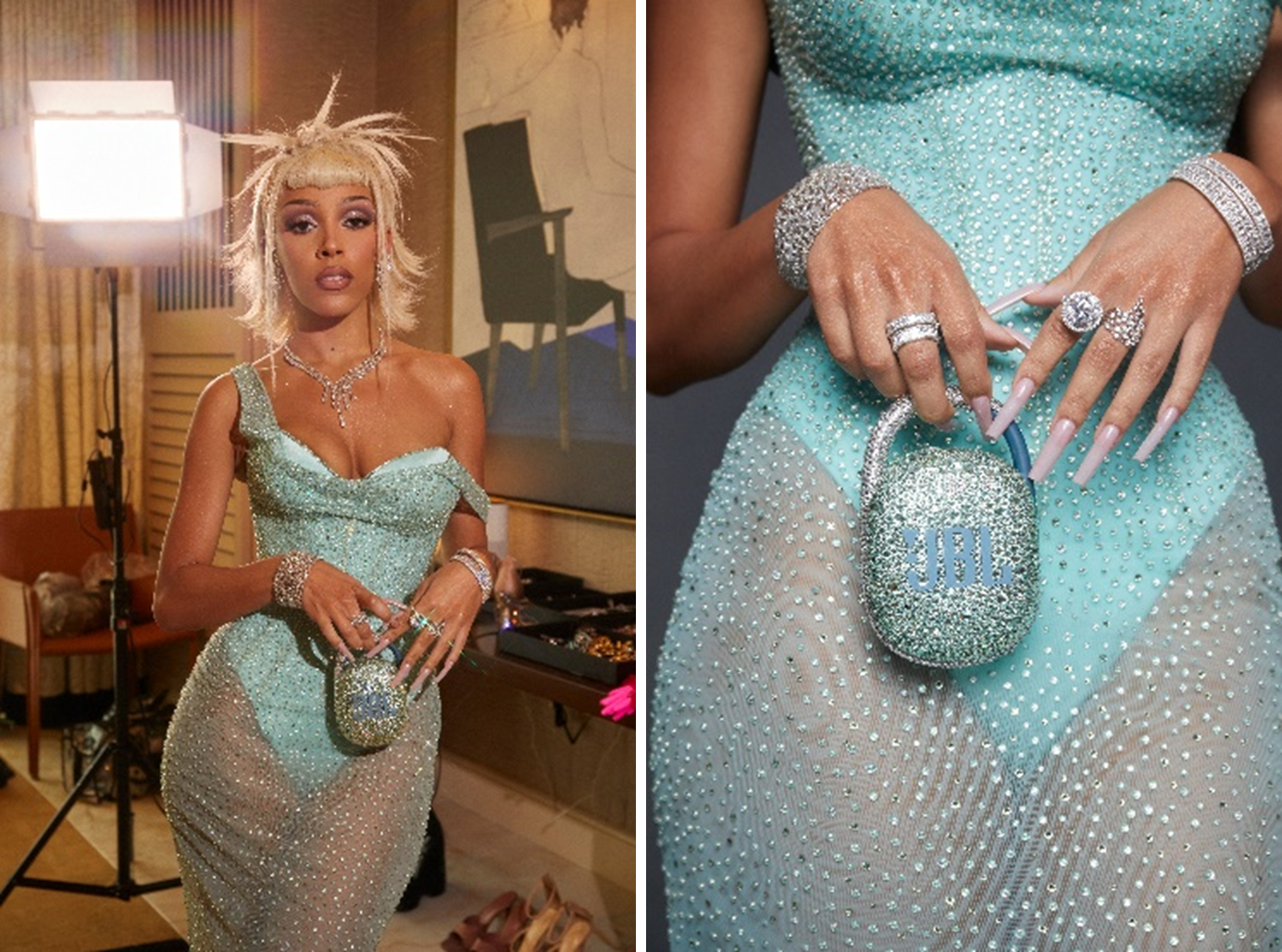 さらに、ドージャは2022年4月に開催された第64回グラミー賞で、最優秀ポップ・デュオ/グループ・パフォーマンス賞を受賞。授賞式当日、華やかなドレスアップでレッドカーペットに現れたドージャは、オリジナルで大胆にデコレーションしたポータブルBluetoothスピーカー「JBL CLIP 4」を装着したハンドバッグを手に持っており、ドージャが「何を着ているのか」「何を持っているのか」ではなく、「何を聴いているのか」という話題で世界中から多くの注目を集めることになりました。