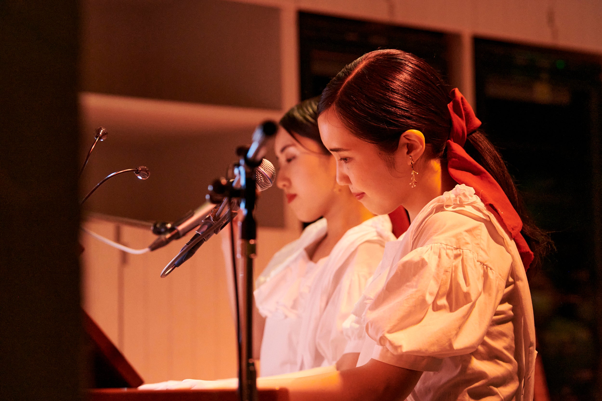会場のアークヒルズカフェは、ウッディな雰囲気の落ち着いた空間。そこに集まった観客たちは、Kitriの世界へ誘うような選曲のBGMに身を委ねつつ、姉妹の登場を心待ちにしている。開演時刻になると白いワンピースに身を包んだ2人が登場し、ドビュッシーの「L’enfant prodigue Prelude」の連弾でライヴの幕を開けた。美しい旋律によって神聖な空気に包まれたかと思えば、同じ連弾で魅せた「踊る踊る夜」で雰囲気が一変。「Bitter」に収録されるこの曲からは、Kitriのもう一つの顔であるダークでミステリアスな一面が垣間見え、ワクワクさせられる。