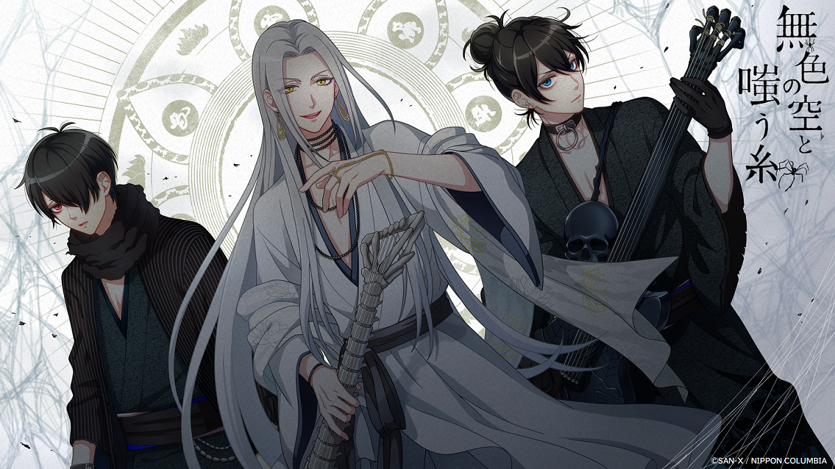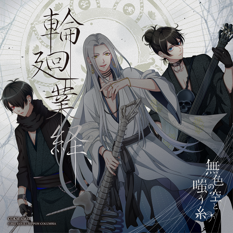 “蜘蛛の糸”をモチーフにしたユニット「無色の空と嗤う糸」は、ノノ(CV:橋本晃太朗)、カン(CV:沢城千春)、クモオ(CV:山下誠一郎)の3人からなるユニット。新曲「輪廻業経」は、これまでボーカルを務めていたノノ(CV:橋本晃太朗)に加えて、カン(CV:沢城千春)、クモオ(CV:山下誠一郎)も譜声を披露するユニット初の全員歌唱曲。同タイトル「輪廻業経」を冠したコミックがコミックNewtypeにて配信中。