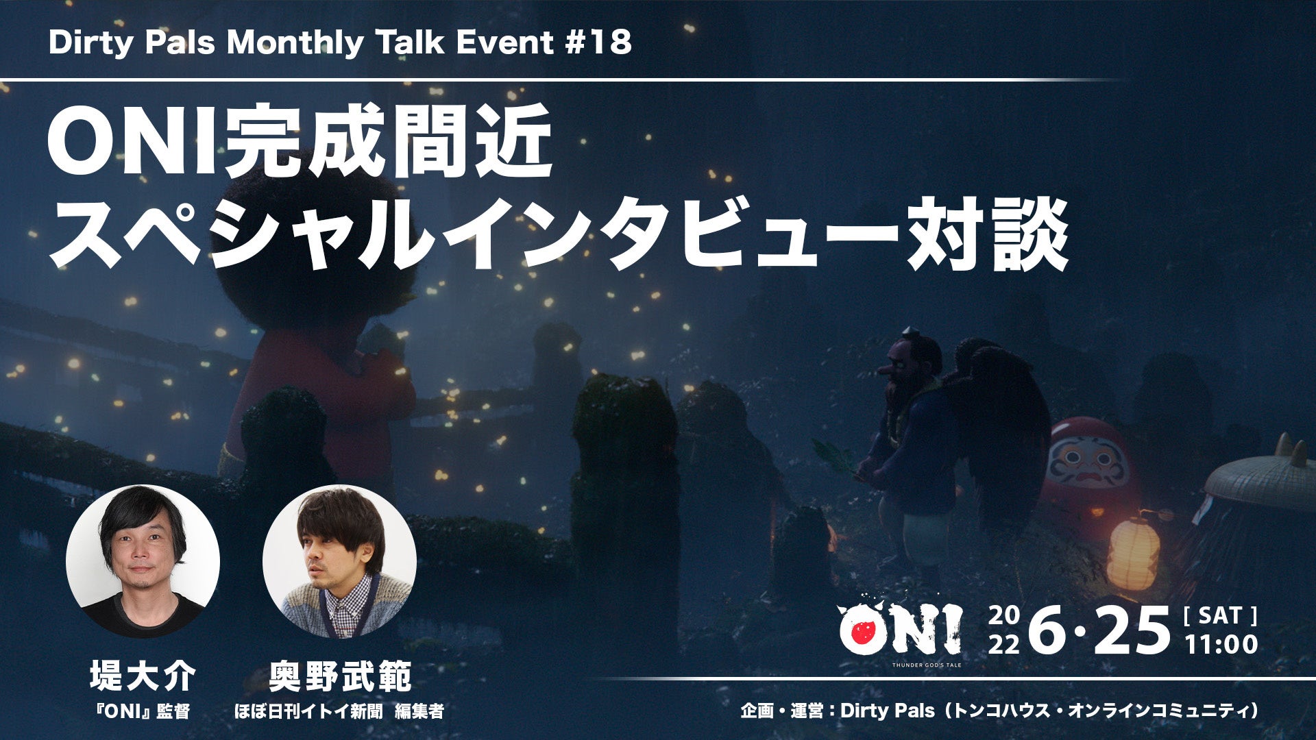 インタビュアーは、堤監督とトンコハウスを長年取材し続けてきた「ほぼ日刊イトイ新聞」編集者の奥野武範氏。コロナ禍ではじまった『ONI』の制作舞台裏、完成までのドラマや珍事件、ストーリーに込められた堤監督の想いなど、時間の許す限りお届けします。