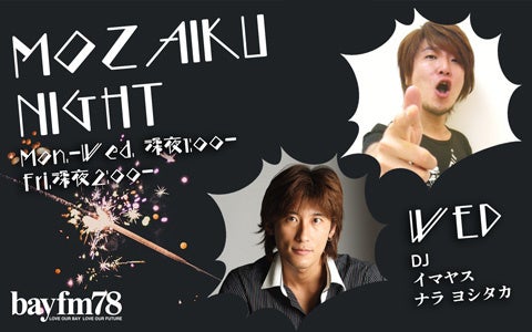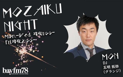 『MOZAIKU NIGHT』はbayfm深夜1時から毎週月曜日から水曜日に賑やかな放送をお届け中!各曜日個性的なDJがそれぞれの色を放ちながら、bayエリアの夜を寝かせません!
