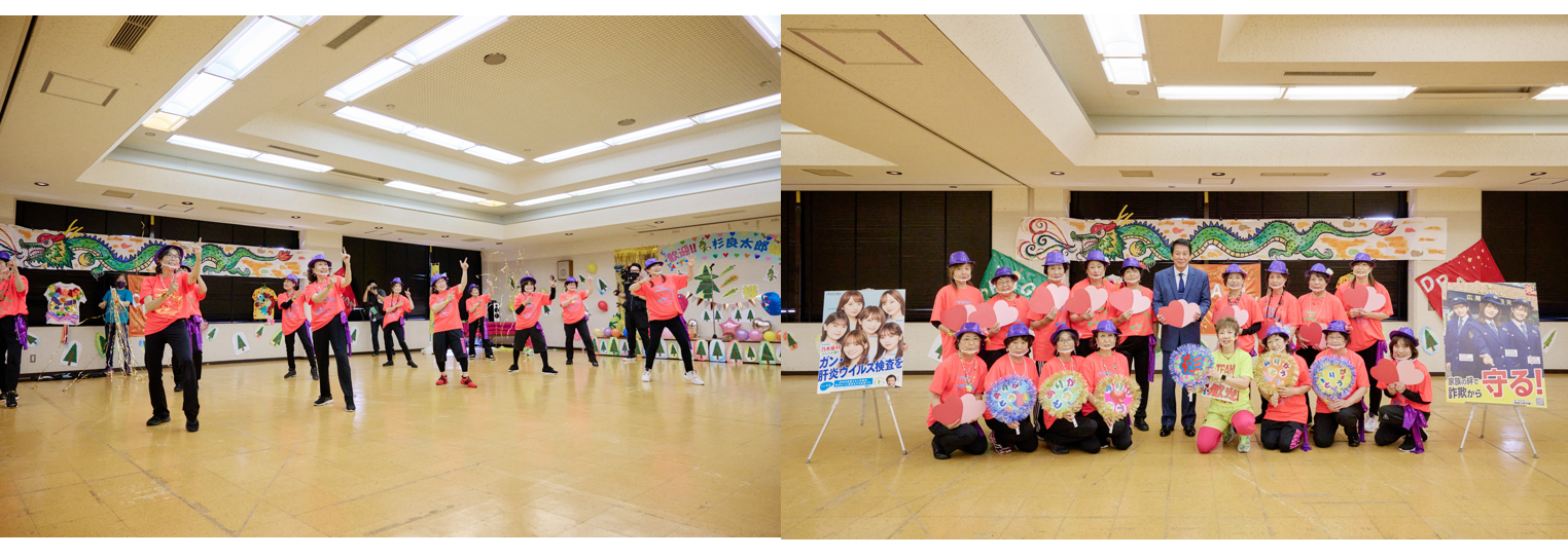 「ゴールドドラゴン」のダンスを間近で見た杉氏は「ダンスをしている高齢者はとても元気です。体を動かしていることに加え、振り付けを覚えたり、音楽のリズムに乗るという普段の生活では経験できないようなことが元気に繋がっているのだと思います。今日のように人前で披露したり、対戦をしたり目標を持つことで、これからも元気で長生きしてほしいです。また、みなさん自身は勿論、肝炎ウイルス検査を受けていただきたいのですが、周りの友人や家族にも肝炎ウイルス検査を受けるようにと伝えてほしいです。」と呼びかけました。ゴールドドラゴンのみなさんも「今日のお話を聞いて検査を受けようと思いました。」と肝炎検査の重要性について理解を深めていただきました。
