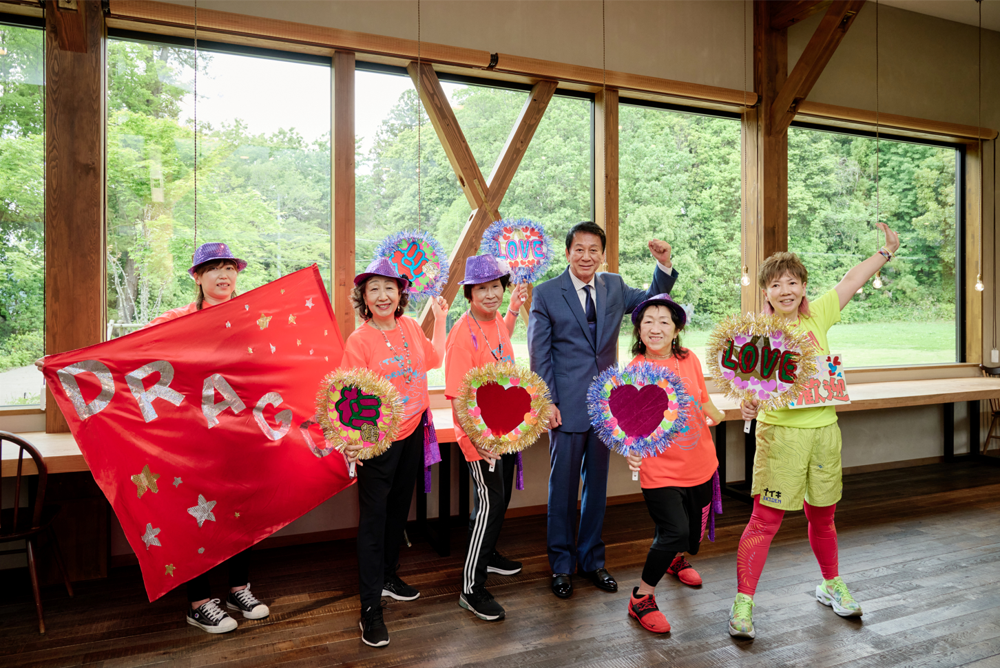 同日、杉氏は飯能市を拠点に活動しているシニアヒップホップダンスサークル「ゴールドドラゴン」の練習場所にも訪問しました。「ゴールドドラゴン」は、杉氏が名誉会長を務める一般社団法人 日本国際ダンス連盟 FIDA JAPANの”ダンス健康クラブ”にも登録しているダンスチームです。チームメンバーの平均年齢はなんと69.7歳。“シルバー”といわれている年代ですが、逆にもっと輝く希望を託して“ゴールド”をチーム名につけています。杉氏に披露するために特別に作った振り付けを踊るということもあり、緊張した面持ちでしたが、曲が始まるとみなさん笑顔を見せながらパワフルなダンスを披露しました。