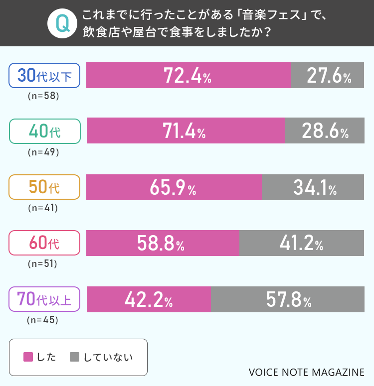 30代以下と40代では、7割以上の方が音楽フェスで食事を「した」と回答しました。