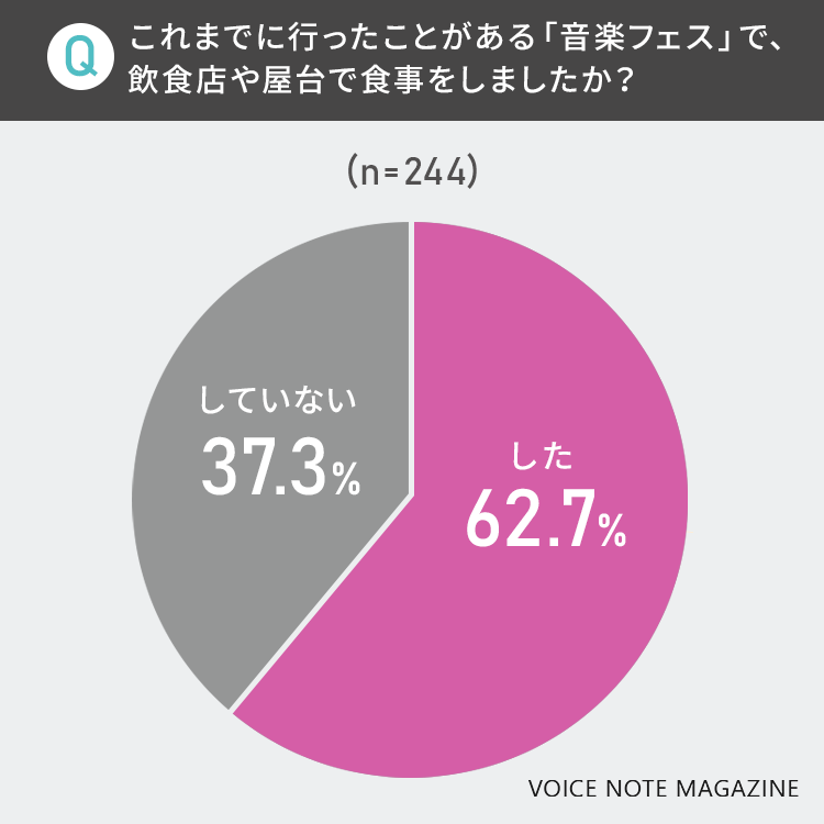 これまでに行ったことがある音楽フェスで、飲食店や屋台で食事をしたことがあるのか聞いたところ、62.7%の方は食事を「した」ようです。