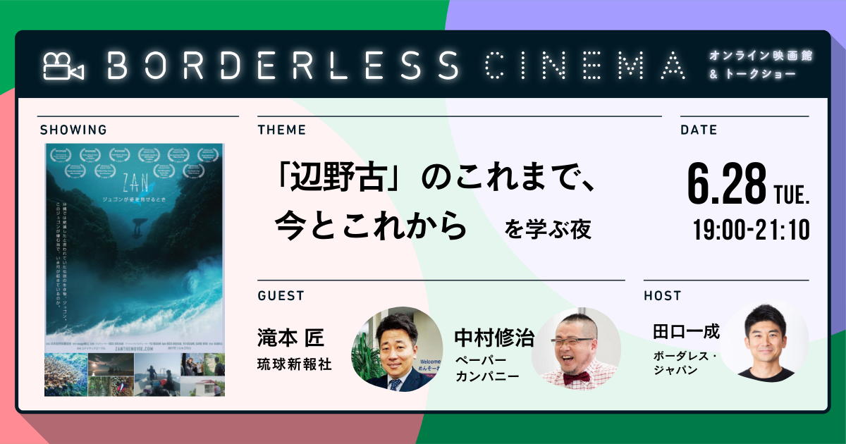 株式会社ボーダレス・ジャパン(代表取締役 田口一成、 東京都新宿区 )は、 社会問題を知るきっかけを提供するオンライン映画館×トークショー「ZAN~ジュゴンが姿を見せるとき~」を、 6月28日(火)に開催します。