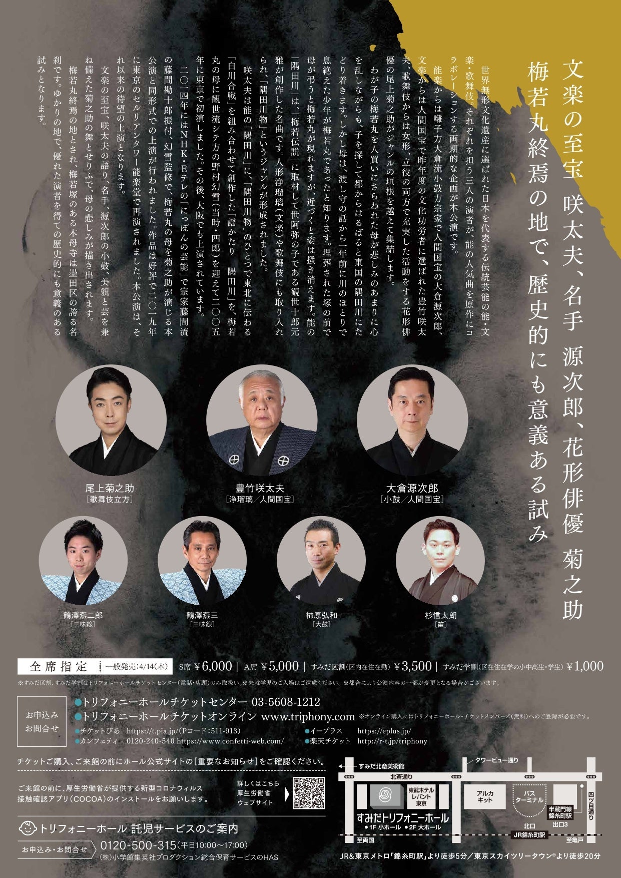 すみだトリフォニーホール開館25周年特別企画として、「隅田川」を取り上げ、今なお、伝統文化の豊かに薫る「梅若伝説」ゆかりの地で、能・義太夫・歌舞伎の各界の第一人者がジャンルの垣根を越えて共演する、珍しいコラボレーションにより上演。