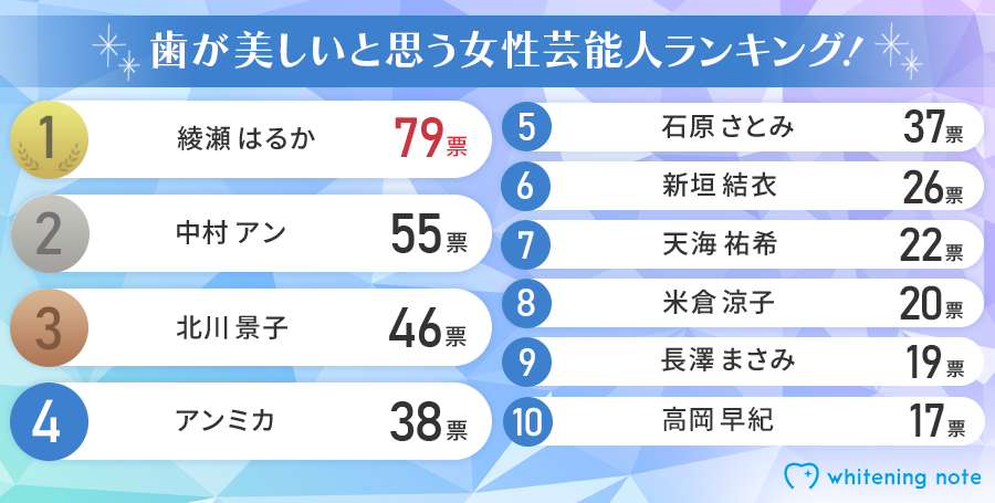 アンケートサイト「ボイスノート」にて、歯が美しいと思う女性芸能人を一人、自由記述で回答していただきました。