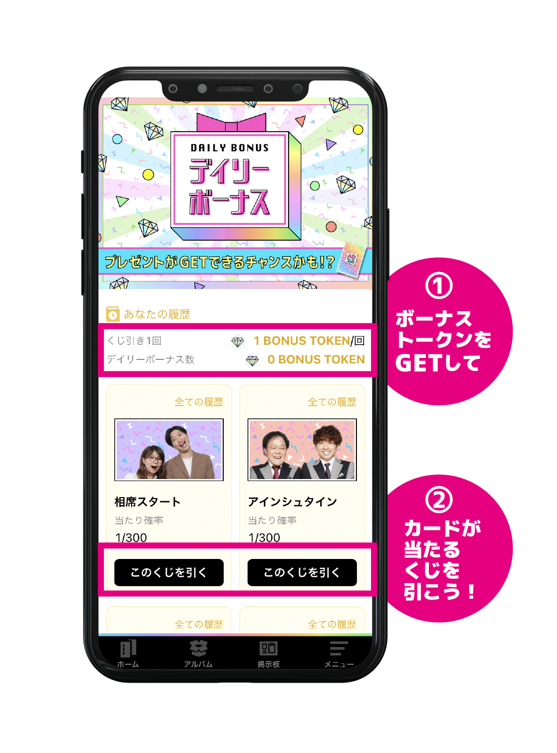 ①アプリ内でカードが当たるくじ引きを引くことのできる