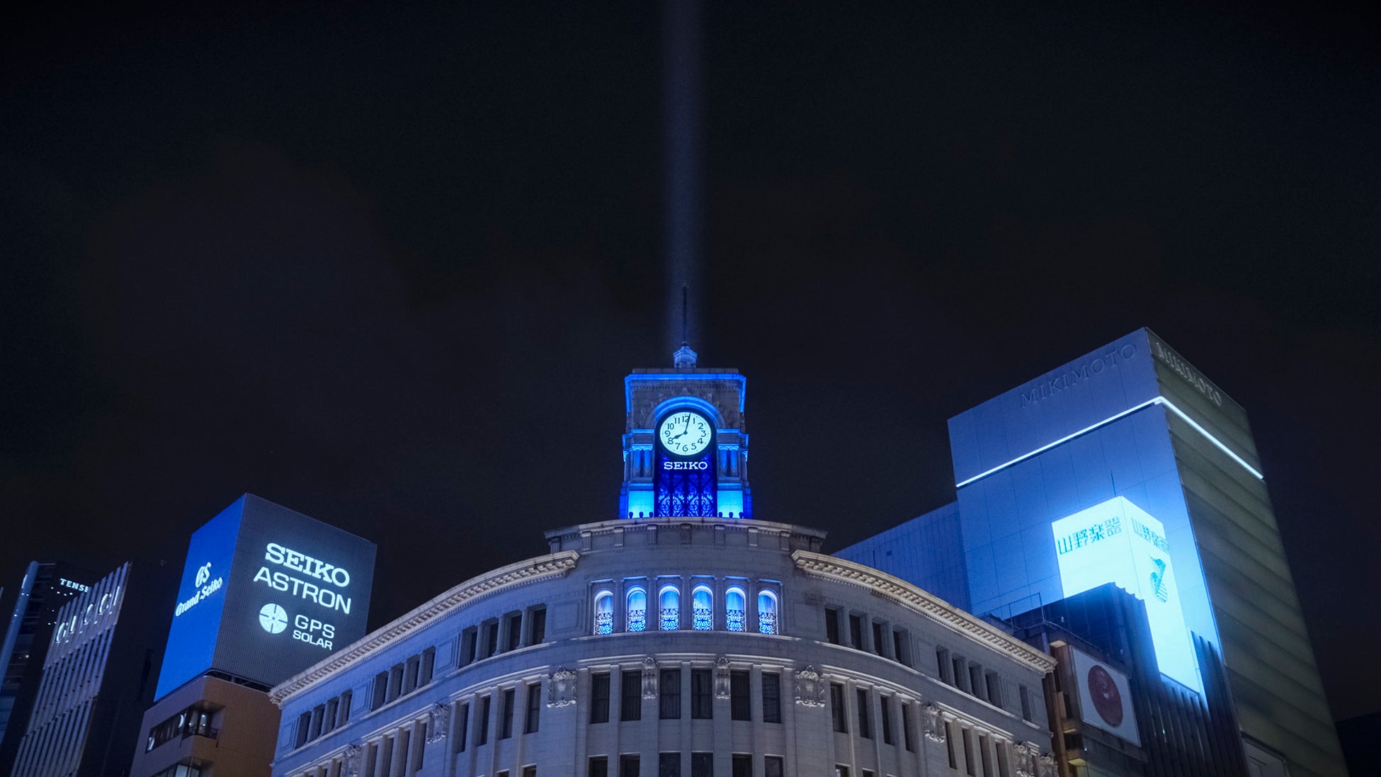 19時から22時まではSEIKO HOUSE GINZAロゴカラーの青い光のライトアップを行います。時計塔正面や建物上部の窓が青く照らされるほか、時計塔の先端からは青い一筋の「時の光」が空へと伸び、SEIKO HOUSE GINZAのオープンを華やかに彩ります。