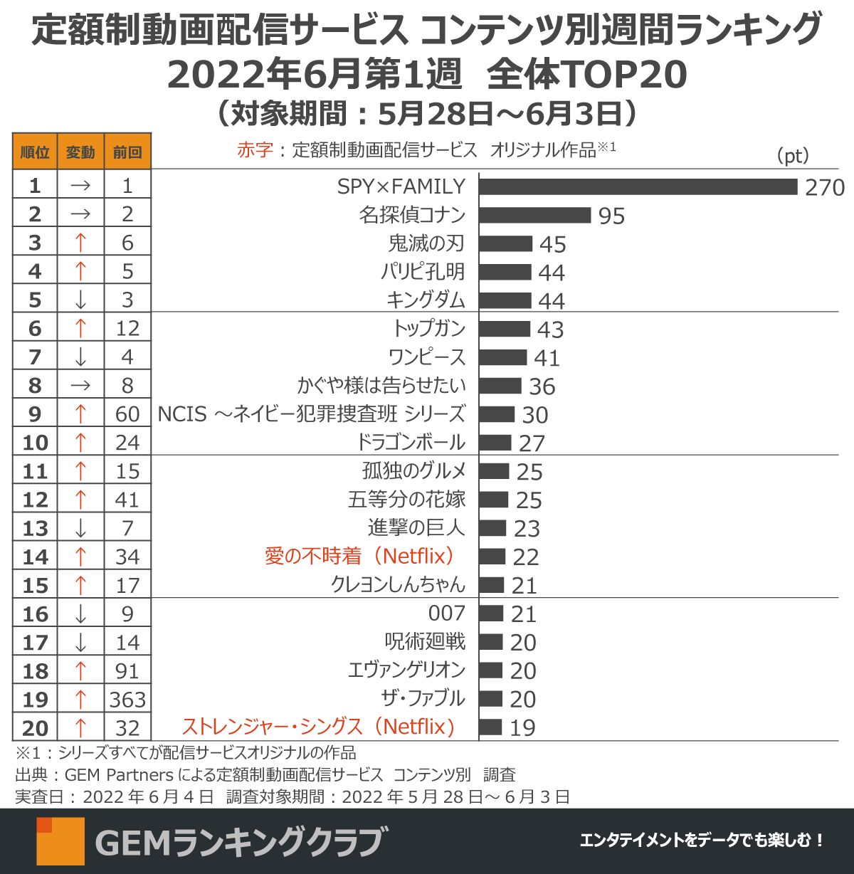 エンタテイメント業界に向けたデータ×デジタルマーケティングサービスを提供するGEM Partners株式会社(ジェムパートナーズ、所在地:東京都港区、代表取締役:梅津文)は6月10日(金)、エンタメコンテンツランキングやデータ情報を発信する「GEMランキングクラブ」プロジェクトにて作成した2022年6月第1週の「定額制動画配信サービス コンテンツ別週間ランキングTOP20(調査対象期間:5月28日~6月3日、調査対象:日本在住15~69歳男女)」を発表します。