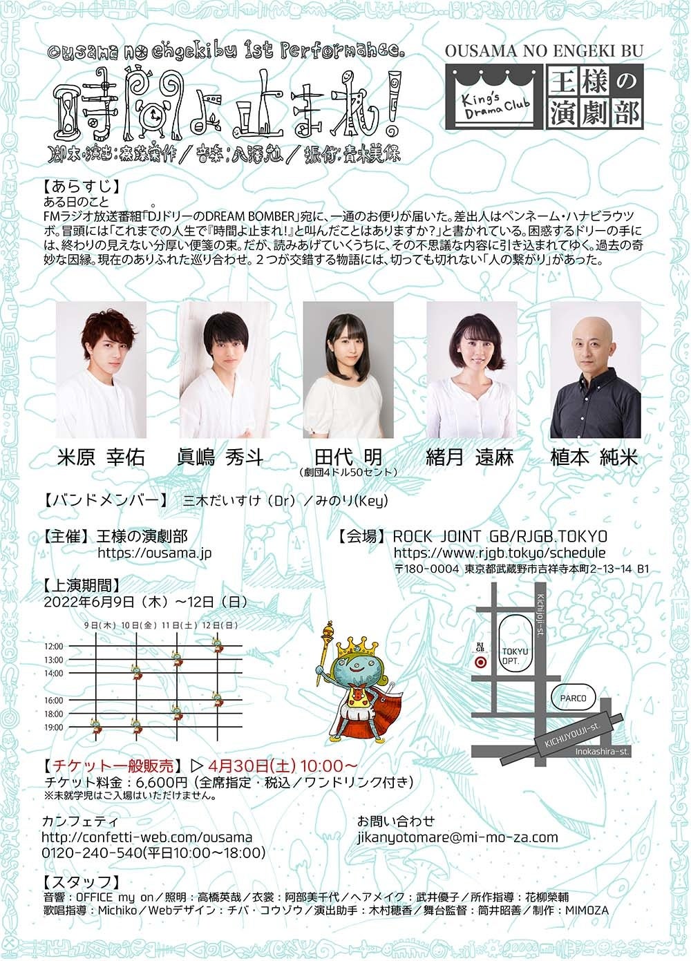 王様の演劇部 1st Performance『時間よ止まれ!』が2022年6月9日 (木) ~2022年6月12日 (日)にROCK JOINT GB(東京都武蔵野市)にて上演されます。チケットはカンフェティ(運営:ロングランプランニング株式会社、東京都新宿区、代表取締役:榑松 大剛)にて発売中です。