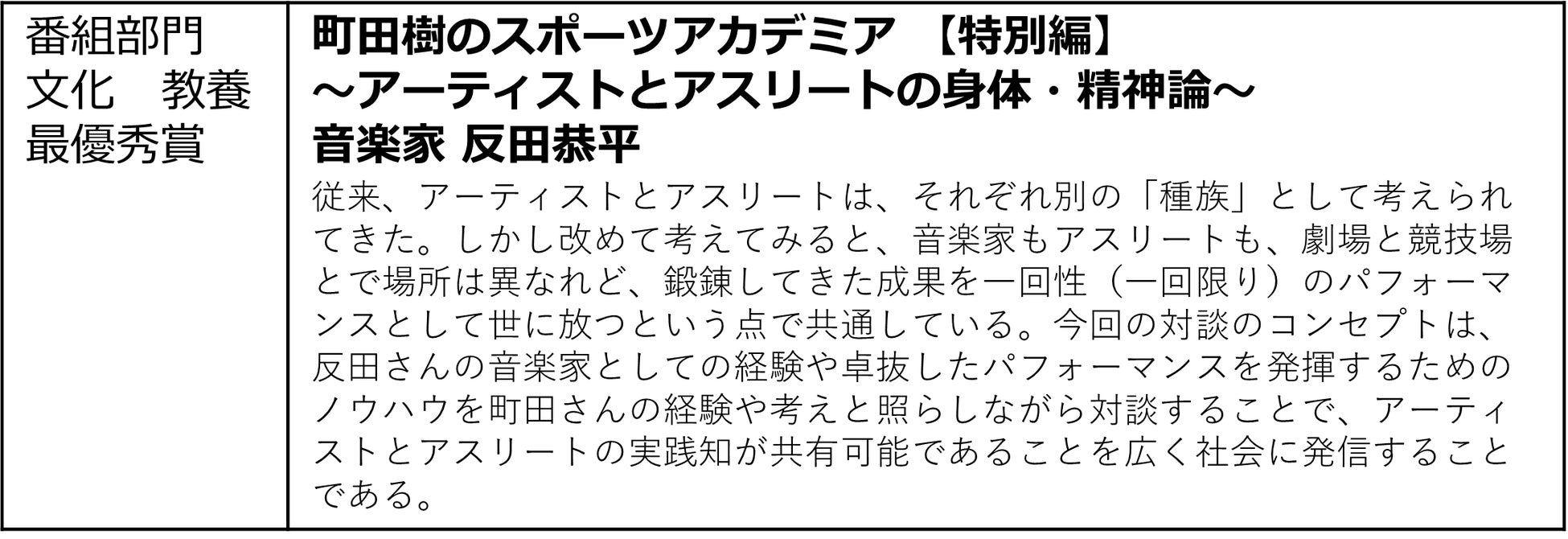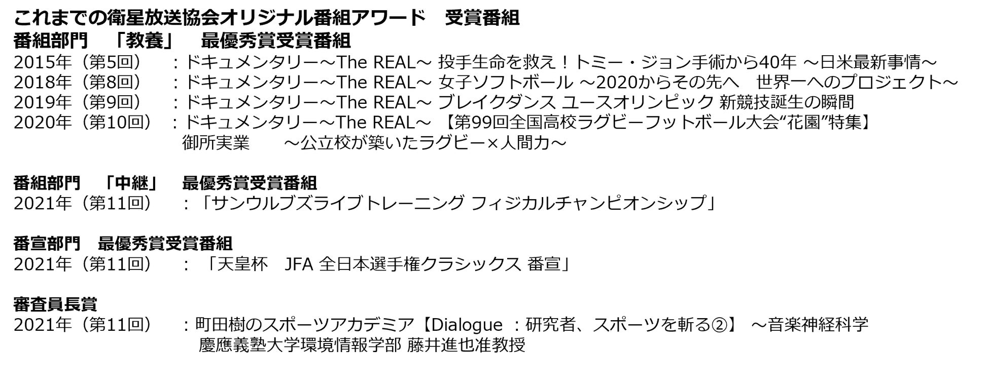昨年の第11回衛星放送協会オリジナル番組アワードでは番組部門中継、番宣部門、審査員長賞で3作品が受賞しました。昨年は審査員長賞を「町田樹のスポーツアカデミア【Dialogue:研究者、スポーツを斬る②】 ~音楽神経科学~慶應義塾大学 環境情報学部 藤井進也准教授」が受賞し、同番組シリーズは2年連続の受賞となります。