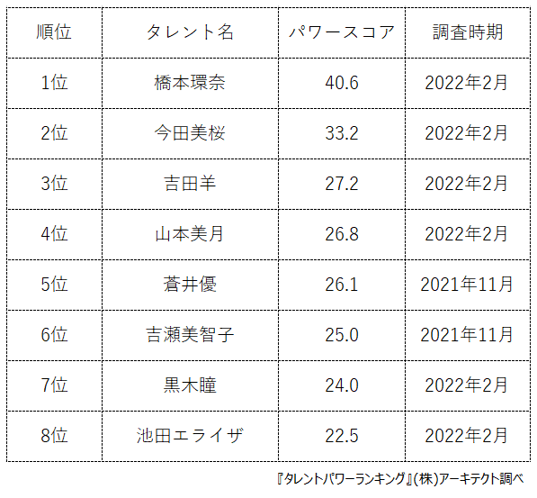 タレントパワーランキング調査は2月、5月、8月、11月に実施。