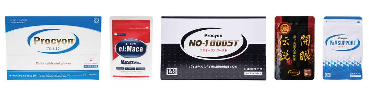 「指定医薬部外品プロキオン」だけではなく、マカを利用した「プロキオン エールマカ」、吸収力で男の自信をブーストさせる「プロキオン エヌオーワンブースト」、高麗人参配合の和漢サプリメント「開眼伝説」、プロキオンシリーズの力をサポートする「プロキオン V&βサポート」など、その他にも男性の悩みを解決する商品がラインナップし、プロキオンシリーズとして展開しております。