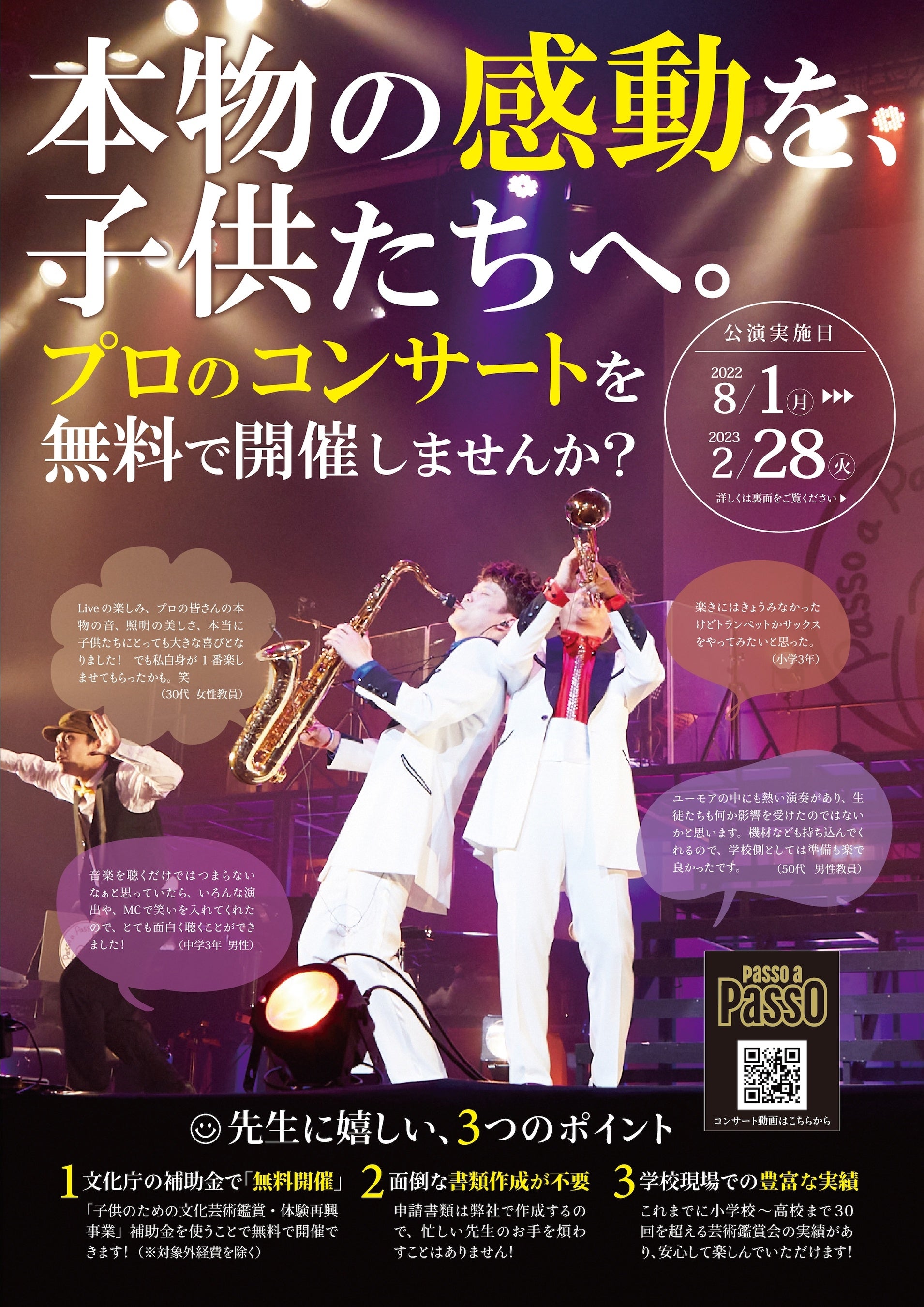 ぱっそあぱっそエンタメ合同会社(千葉県柏市 CEO藏持智明)は、プロのコンサートを全国各地の学校で無料開催できる、文化庁の「子供のための文化芸術鑑賞・体験再興事業」を用いたサービスの提供を開始しました。