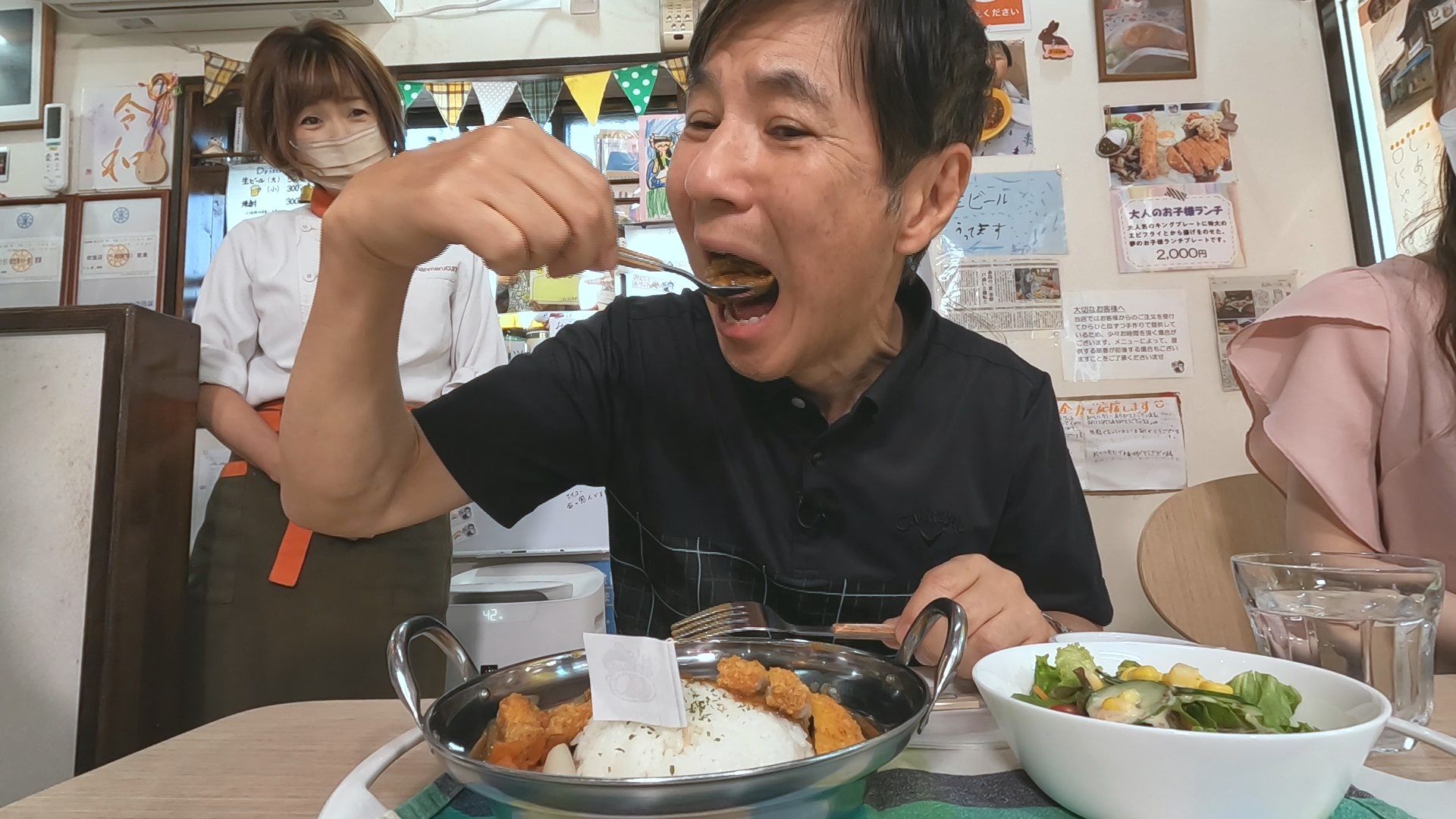 実は今はダイエット中で、普段はカレーを控えているんですよ。121kgから9カ月かけて体重を落としたのに、リバウンドしちゃって……。36kg落としたけど36kg増えて、気づけば121kgに戻るというV字回復を達成! なので、今日は朝ごはん抜きでロケに来ました。おいしいカレーをおなかいっぱい食べられて満足です!(ゆいP)